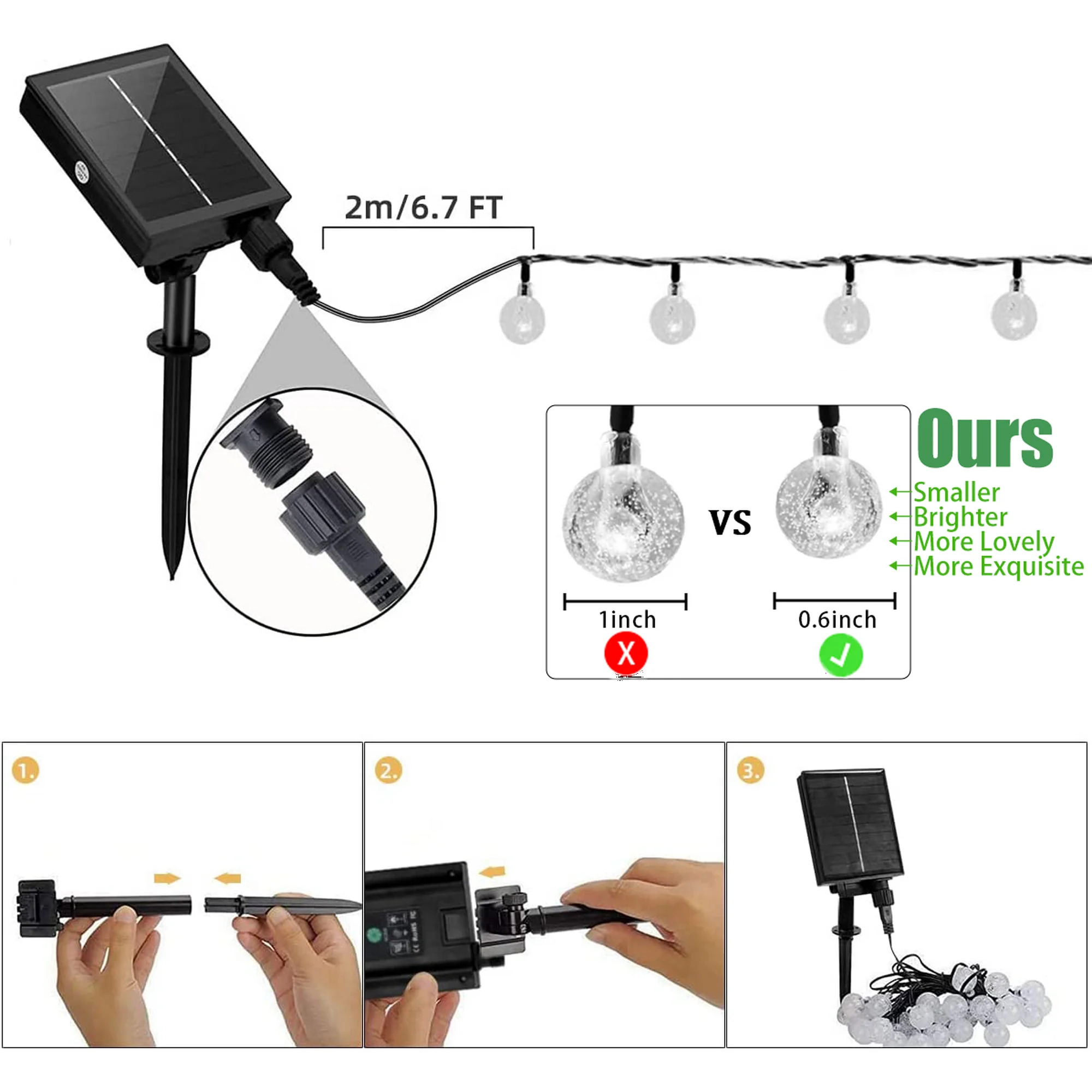 • Specifications: Yellow light color, green string color, 60 lights, 1-inch bulb diameter, 30 ft string length with 6.6 ft lead length, rechargeable 800mAh battery.