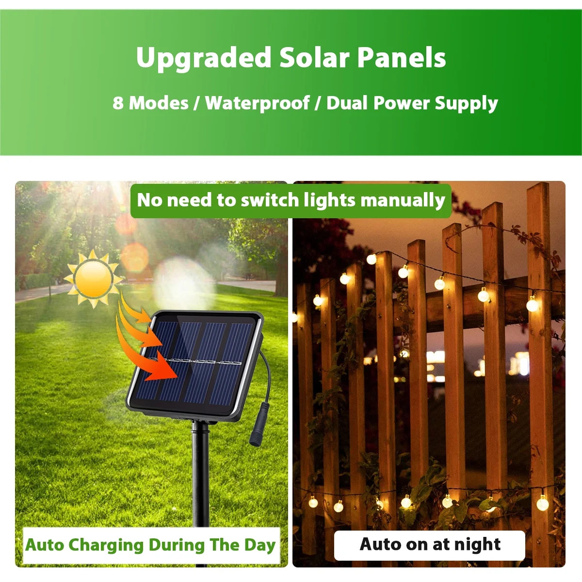 • Energy Efficient: Solar powered with zero power cost, lights automatically turn on at night and can illuminate for over 8 hours when fully charged.